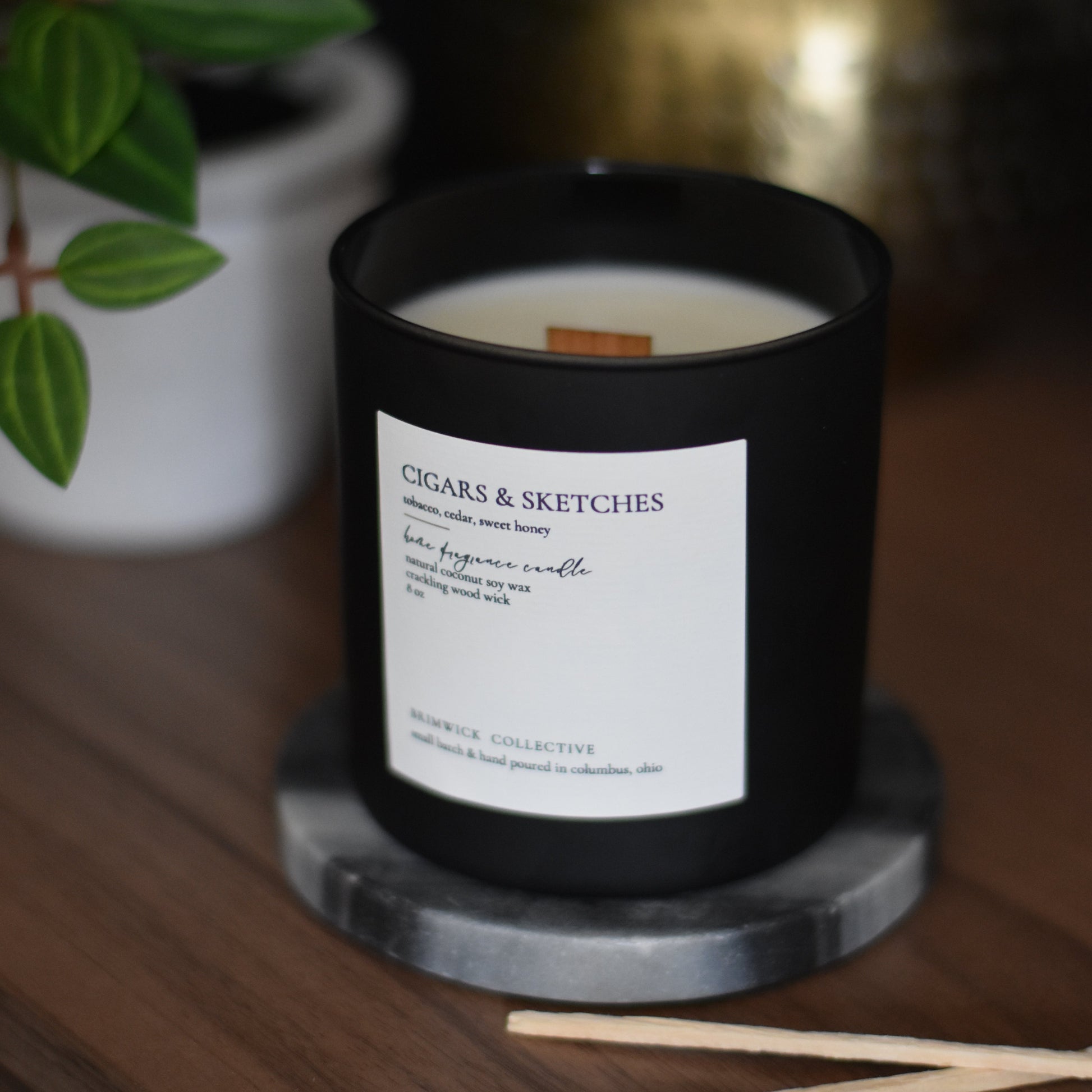 Cigars & Sketches. A scent for any time of the year, a new staple scent to your home. Surround your home with sweet honey, cedar and smooth tobacco A subtle hint of leather and dark musk ties it all together for a sophisticated and luxurious scent. Both masculine and feminine. Create the perfect mood as if you're cozying up to a book in the library or - grab a cigar, head to the study and get inspired on paper.